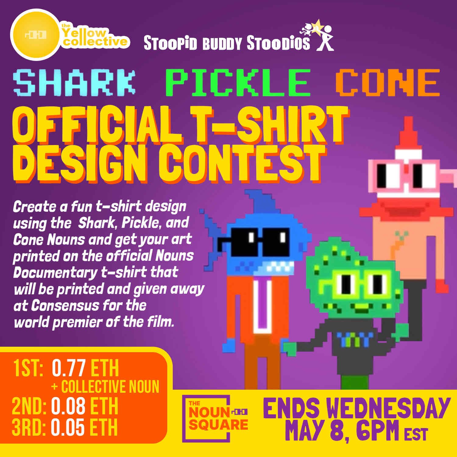 “Shark, Pickle, Cone” is a nouns-funded documentary premiering at Consensus & we want YOU to create the Official T-Shirt! Make an original design, win from over 1 ETH in prizes. #1 will be featured on the Official Tee! 🥇 0.77 ETH + 1 Collective Noun 🥈 0.08 ETH 🥉 0.05 ETH Submit: uplink.wtf/contest/370 https://imagedelivery.net/BXluQx4ige9GuW0Ia56BHw/7980ecbf-c644-4a93-f17f-62ed4bff3800/original http://uplink.wtf/contest/370