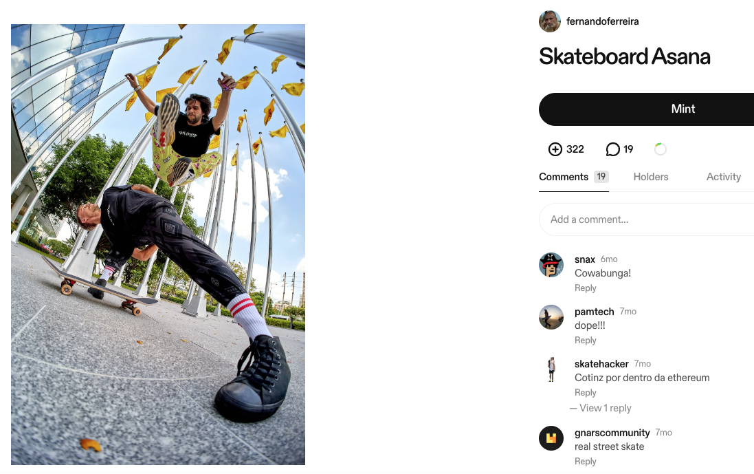 In addition to being featured and printed in 7Capas magazine, this picture (zora Mint) was one of my first viral photos on Zora—made possible with the support of key builders and marking the beginning of my onchain work in collaboration with GnarsDAO.