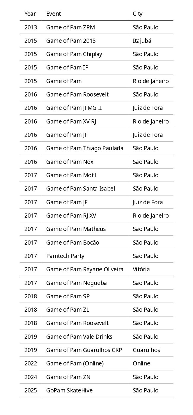 Over the years, Game of Pam has toured several cities across Brazil, strengthening local skate scenes in a collaborative and independent way. Each edition contributes to local development by connecting skateboarders, independent brands, and grassroots cultural initiatives rooted in their communities.